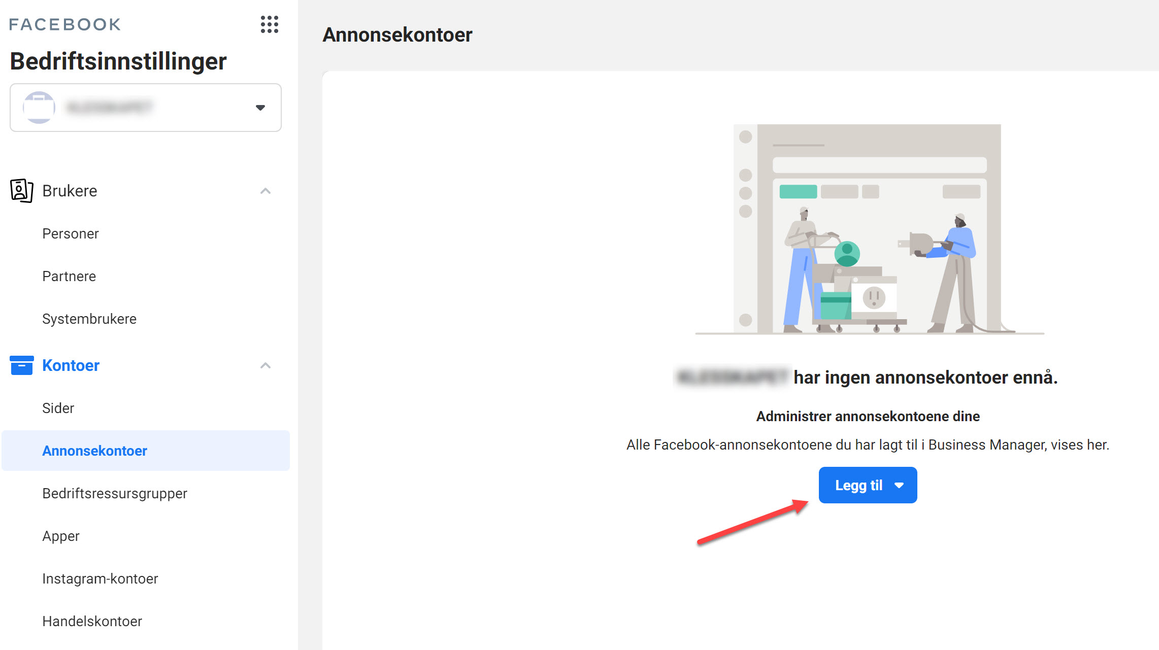 4) Dersom du har en eksisterende annonsekonto for Facebooksiden din kan du velge "legg til annonsekonto". Eksempelvis dersom du har fremmet innlegg på din Facebook side